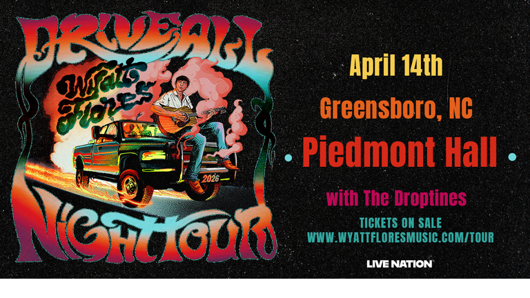 Wyatt Flores is bringing his Drive All Night Tour to Piedmont Hall April 14, 2026! Pull those cowboy boots out because we'll be singing and boot scootin' all night. Don’t miss your chance to see one of country’s rising stars live in Greensboro!